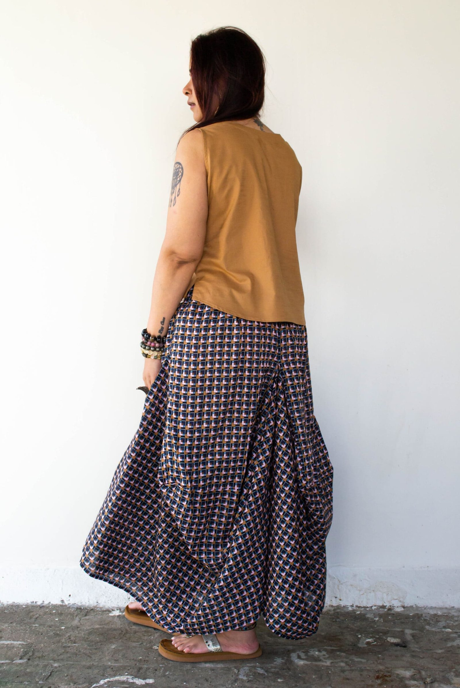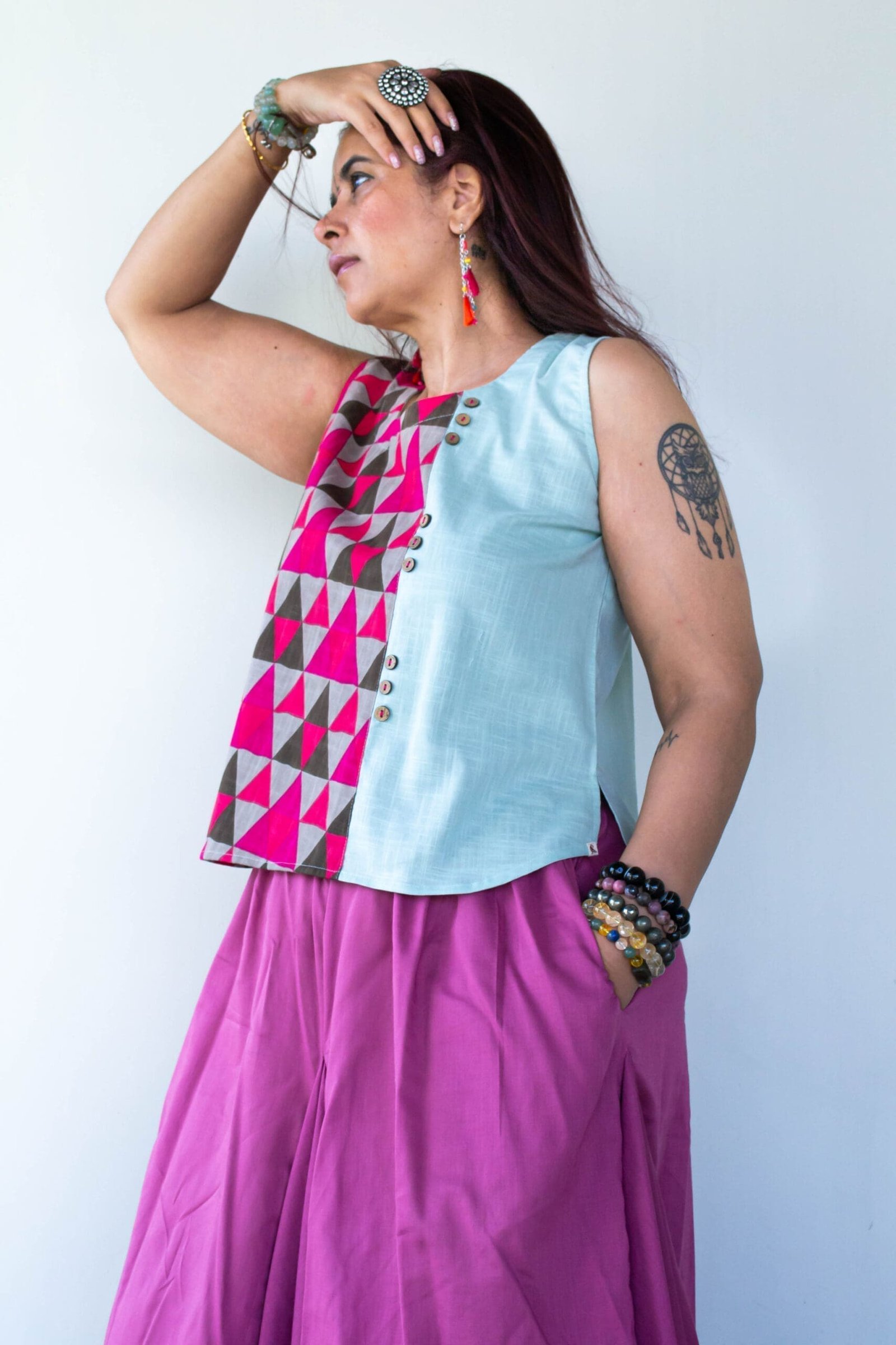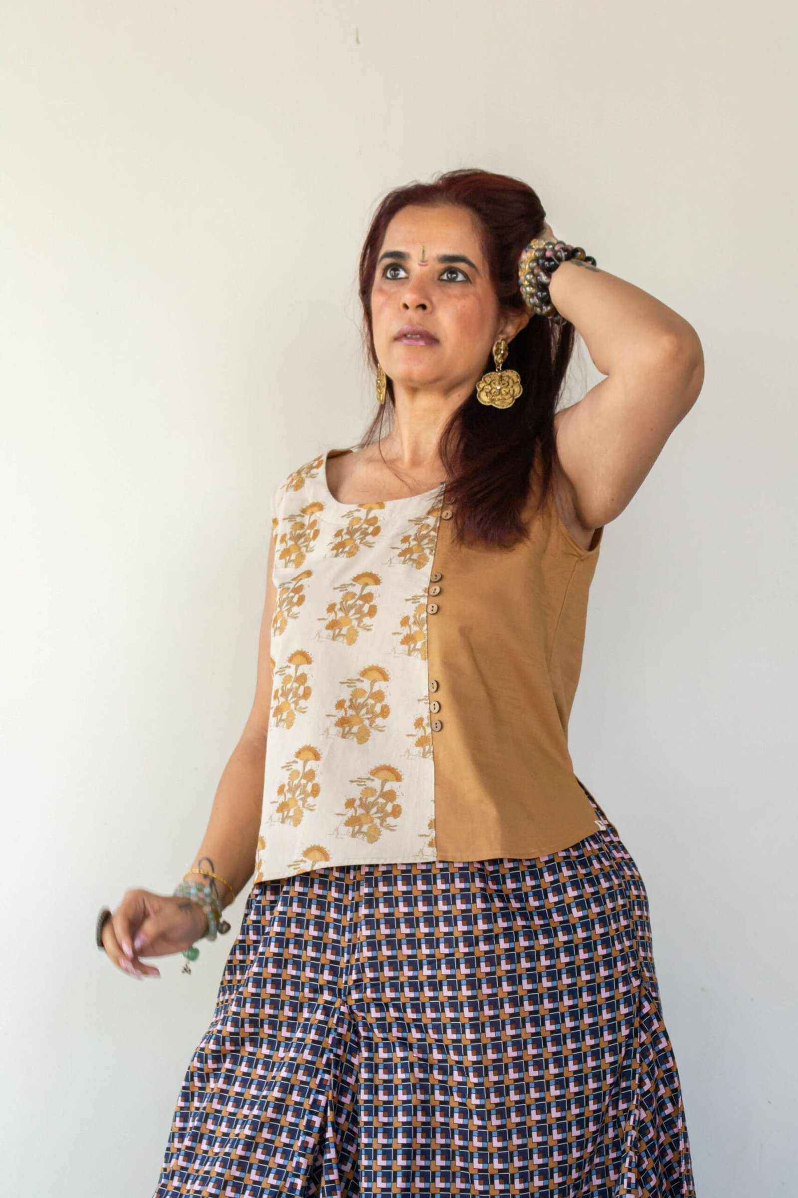Two Tone Patched Blouse is a short linen top by Label Zuka – a masterpiece of design, seamlessly blending contemporary fashion with a touch of ethnic allure. Crafted with meticulous attention to detail, it’s a versatile piece that effortlessly transitions from casual chic to festive elegance. Stylish and adaptable to a range of settings, this short linen top with the half-printed vertical fabric panel can be paired with trousers or transitioned into a festive look by pairing it with a flowy skirt and traditional jewellery.